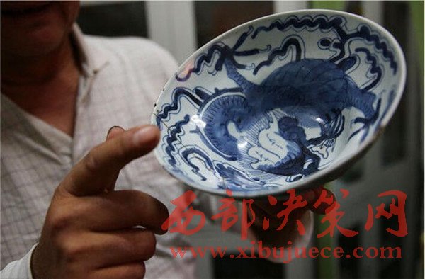 2016年9月23日,陕西榆林,清乾隆青花瓷过桥龙图案从碗外延伸到碗内。