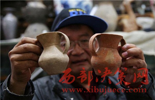 2016年9月23日,陕西榆林,“这件是辽代的石榴樽,你看上面的鸳鸯多漂亮。”刘福学打开他的木箱,向来客展示他的藏品。