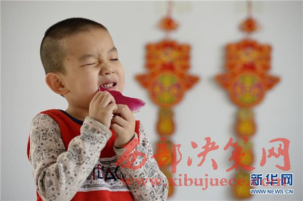 2月3日,河北省邢台市桥东区三义庙社区的儿童在社区儿童娱乐室吃萝卜“咬春”。