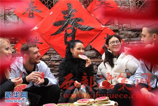 2月3日,在山东省临沂市沂南县竹泉村,来自俄罗斯的游客玛丽娅(中)与同伴在开办农家乐的村民肖蕊(右二)家中吃生萝卜,体验“咬春”。
