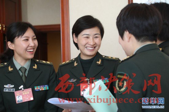 3月7日,全国人大代表刘洋(左二)等在解放军代表团小组会议间隙交流。在两会会场内外,女代表、女委员、女工作人员、女记者在工作中尽职尽责,展现着自己的风采。
