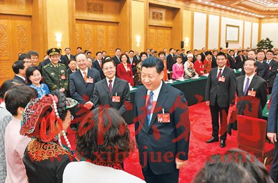 3月8日,中共中央总书记、国家主席、中央军委主席习近平参加十二届全国人大五次会议四川代表团的审议。在“三八”国际劳动妇女节到来之际,习近平代表党中央、国务院,向参加全国两会的女代表、女委员、女工作人员,向全国各族各界妇女同胞,致以节日的祝贺和诚挚的祝福。这是习近平同女代表亲切交谈。