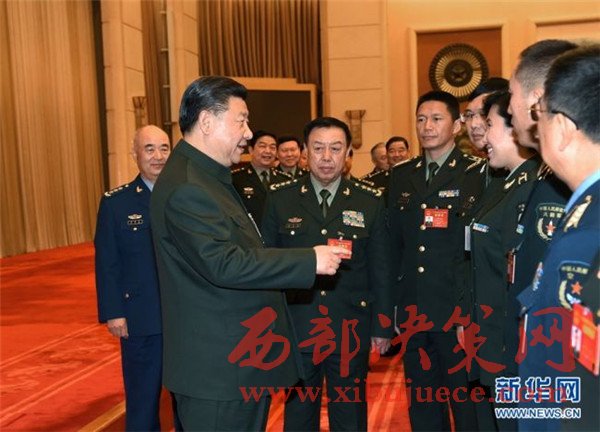 3月12日,中共中央总书记、国家主席、中央军委主席习近平出席十二届全国人大五次会议解放军代表团全体会议并发表重要讲话。这是会议结束时,习近平亲切接见来自基层部队的部分军队人大代表。