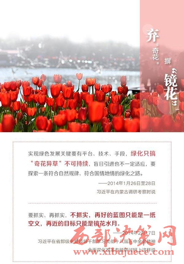 2014年,习近平在内蒙古考察时,针对内蒙古大草原的生态环境保护,习近平说:“绿化只搞‘奇花异草’不可持续,盲目引进也不一定适应,要探索一条符合自然规律、符合国情地情的绿化之路。”