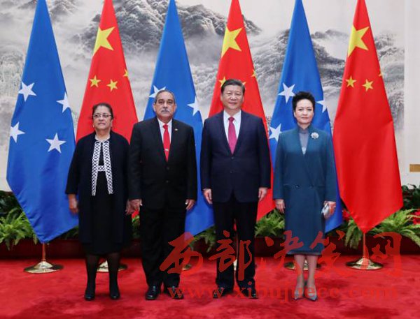 3月27日,国家主席习近平在北京人民大会堂同密克罗尼西亚联邦总统克里斯琴举行会谈。会谈前,习近平在人民大会堂东门外广场为克里斯琴举行欢迎仪式。这是习近平和夫人彭丽媛同克里斯琴总统夫妇合影。