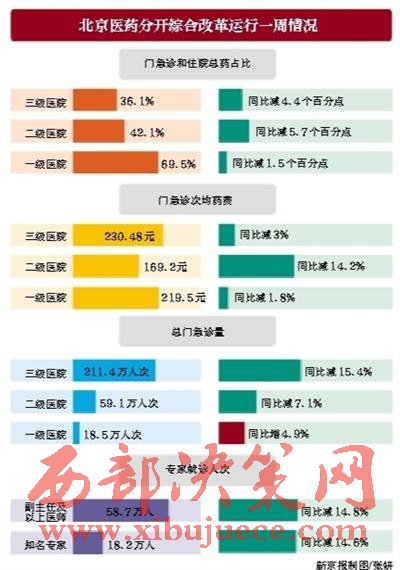 北京市卫计委昨天发布的统计数据显示,从4月8日零时至4月15日24时,北京医药分开综合改革实施一周来,全市221家纳入监测的医疗机构药占比及药费均呈下降趋势,在就诊人数方面,二级、三级医院门急诊量有所下降,一级医院和社区卫生服务中心门急诊量则有所上升。“看专家难”有所缓解。