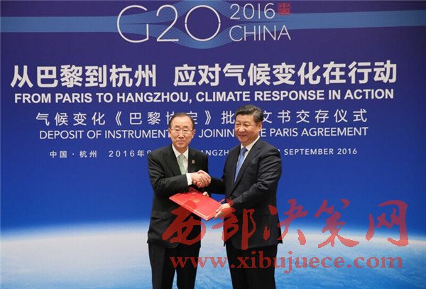 2016年9月3日,国家主席习近平同美国总统奥巴马、联合国秘书长潘基文在杭州共同出席气候变化《巴黎协定》批准文书交存仪式。这是习近平向潘基文交存中国气候变化《巴黎协定》批准文书。(记者 兰红光 摄)