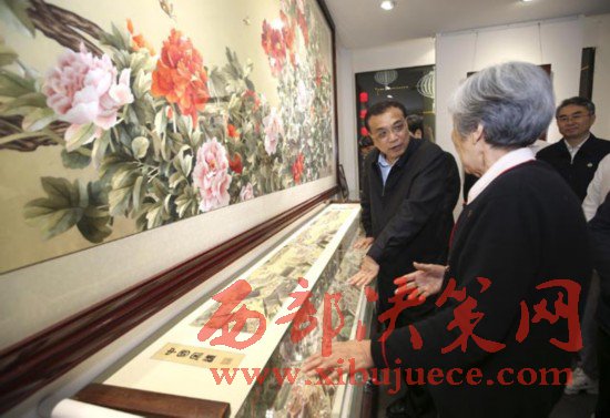 李克强2017年5月8日晚来到开封七盛角民俗文化街,在王素花汴绣馆长时间驻足。82岁的王素花多年继承创新宋代传统刺绣工艺,是汴绣领军人物。总理仔细观赏后称赞她用色“多而不杂”,技艺“炉火纯青”。