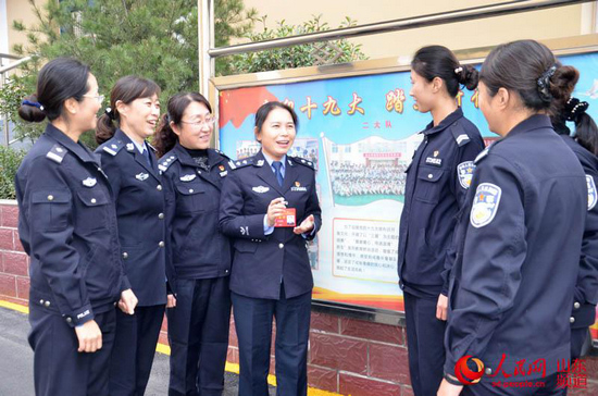 山东省女子强制隔离戒毒所医疗康复科科长李芙蓉向同事宣讲十九大精神。刘桂珍 摄