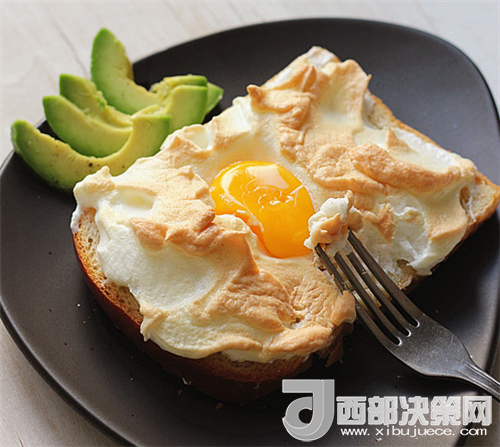 4.用刮刀把蛋白霜涂抹到土司上,不用抹平,中间留个小坑,蛋黄放中间,就用一个鸡蛋,只有一个蛋黄。