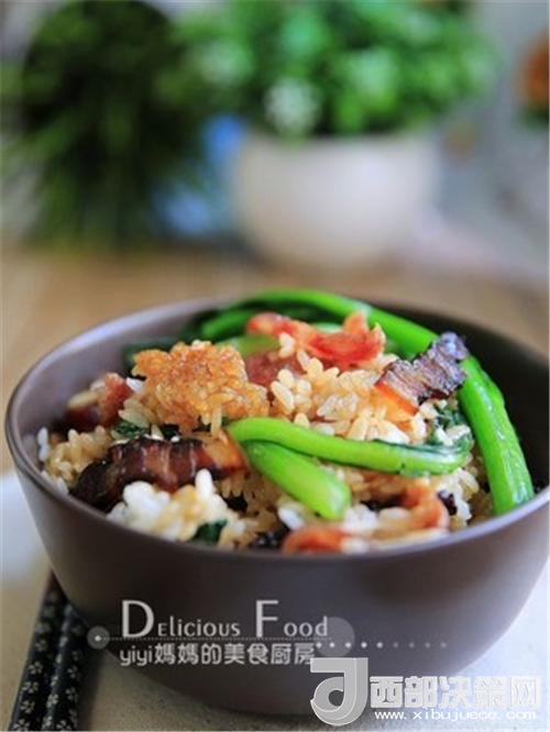 大米两量杯、腊肉1块、广式腊肉3根、菜心1小把、植物油适量。