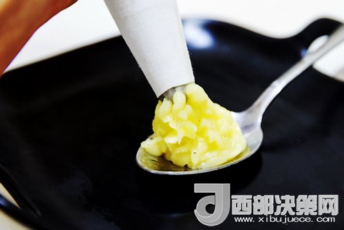 食材:土豆、浓缩鸡汁、黄油、蓝莓酱、黑胡椒。