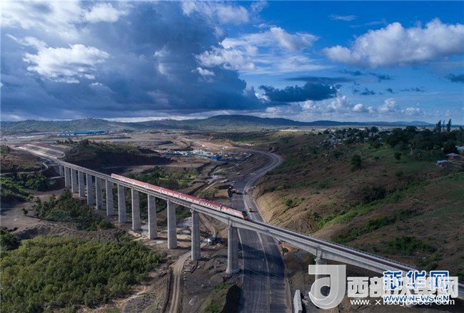 2017年5月12日,列车从肯尼亚蒙内铁路沿线的马泽拉斯铁路大桥上驶过。蒙内铁路连接肯尼亚首都内罗毕和东非第一大港蒙巴萨,全长约480公里,是一条采用中国标准、中国技术、中国装备建造的现代化铁路。记者陈诚摄