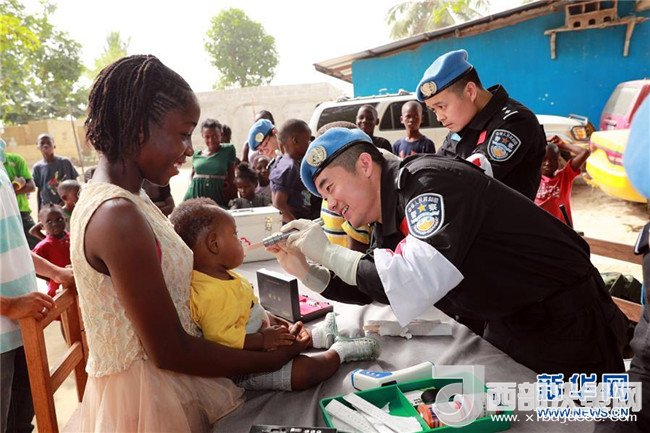2017年12月28日,在利比里亚蒙罗维亚,中国维和警察防暴队医疗人员为儿童做口腔检查。当日,中国第五支驻利比里亚维和警察防暴队派出医护人员前往蒙罗维亚市本森威尔社区孤儿院,为儿童和员工进行义诊。(赵小新摄)