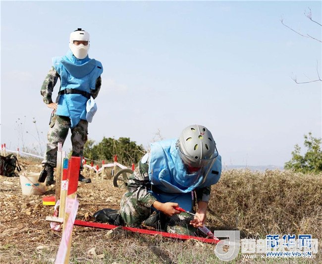2017年11月8日,在黎巴嫩南部黎以边境“蓝线”附近的扫雷作业点,中国工兵新作业手在组长的指导下进行扫雷作业。2017年10月初,中国维和部队接到联合国驻黎巴嫩临时部队(联黎部队)任务,要求清排一片面积超过1万平方米、埋有千余枚防步兵地雷的雷场。(董永康摄)