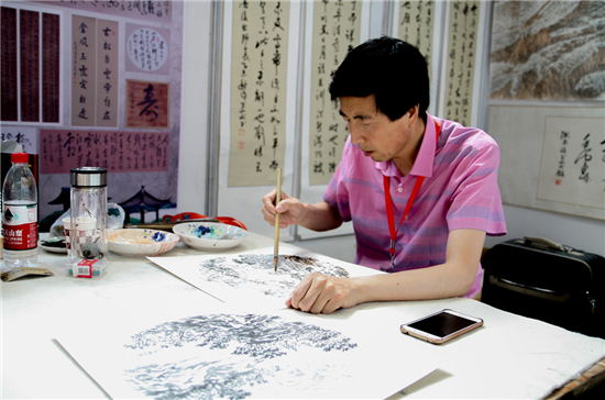 甘肃画家卢旭东正在展会中心书画展区创作国画