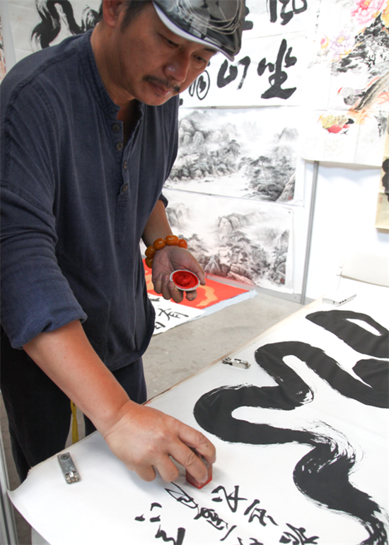中华一笔龙许超然正在为一幅刚刚创作完成的书法作品落款盖章