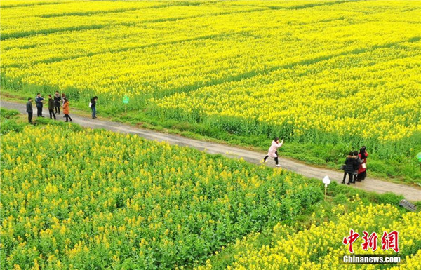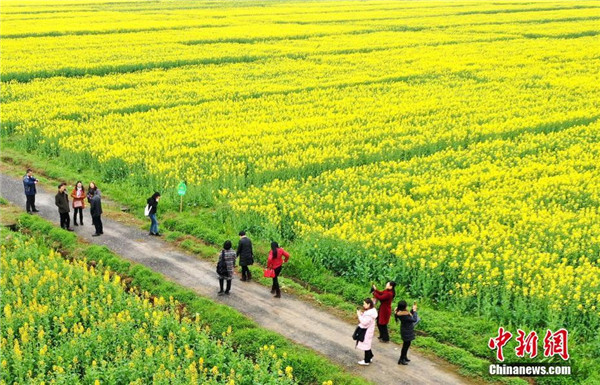 3月2日,江西省吉水县乌江镇枫坪千亩油菜花基地油菜花盛开,许多游客前来观赏拍照徜徉在花海中。郭弘毅 摄