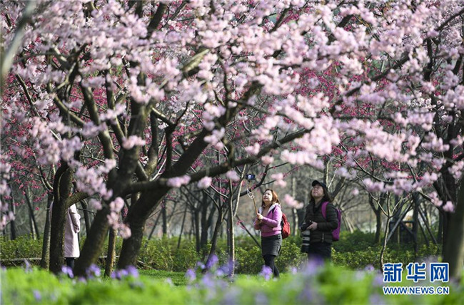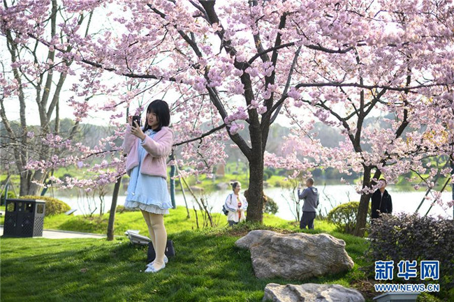 3月13日,游客在武汉东湖樱园赏樱拍照。新华社记者 熊琦 摄