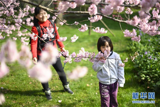 3月13日,一名小朋友和家人在武汉东湖樱园赏樱。新华社记者 熊琦 摄