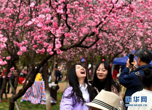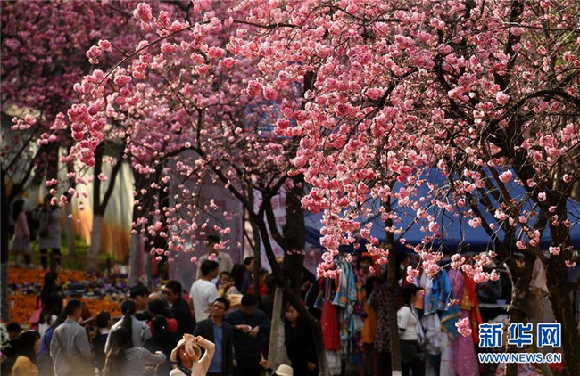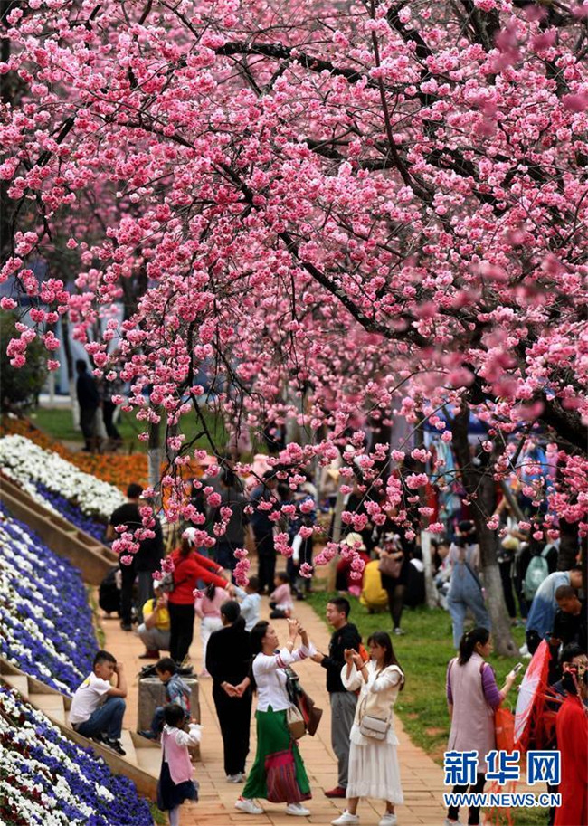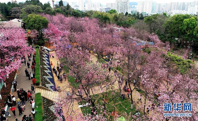 近日,云南省昆明市迎来樱花盛开的时节。昆明圆通山公园的数千株樱花灿烂绽放,吸引了市民和游客前来观花赏景。