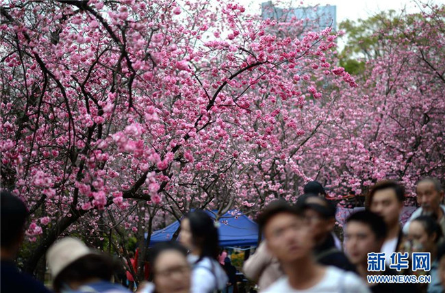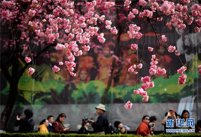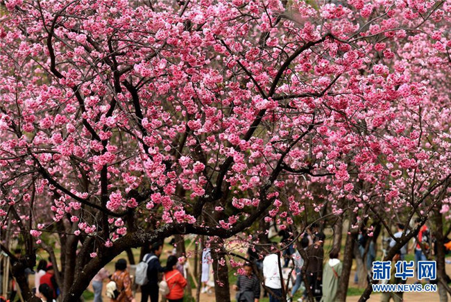 游人在昆明圆通山公园观赏盛开的樱花(3月16日摄)。新华社记者 蔺以光 摄