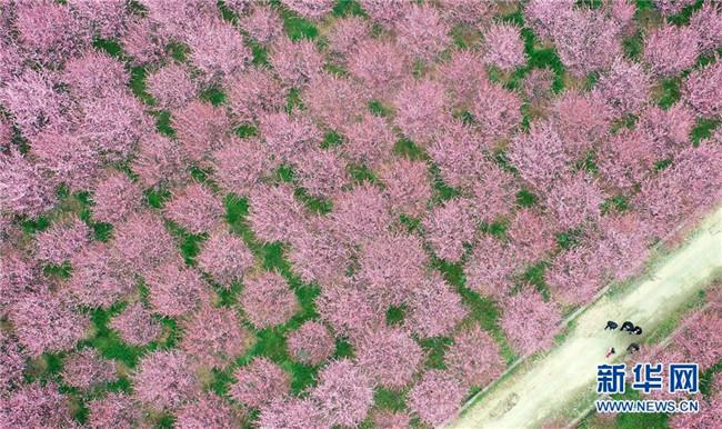 3月19日,游人在陕西勉县新街子镇观赏美人梅(无人机拍摄)。近日,陕西省汉中市勉县新街子镇数十亩美人梅开放,吸引游人前来踏春赏花。 新华社记者 刘潇 摄