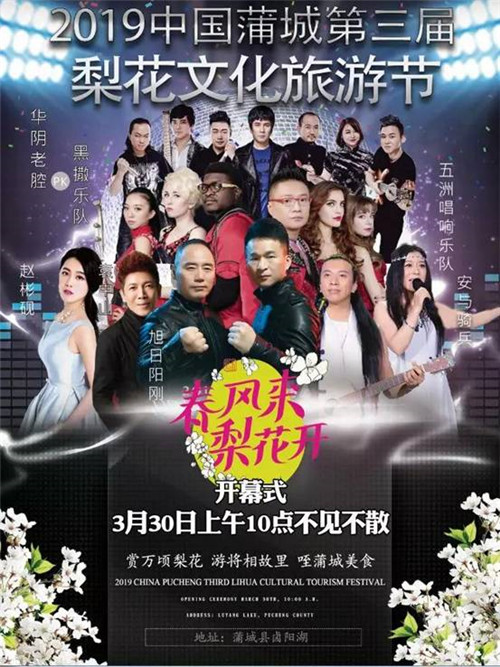 内容:“春风来 梨花开”2019中国蒲城梨花文化旅游节开幕式盛大文艺演出与您相约,阵容强大、星光熠熠唱响蒲城大地。