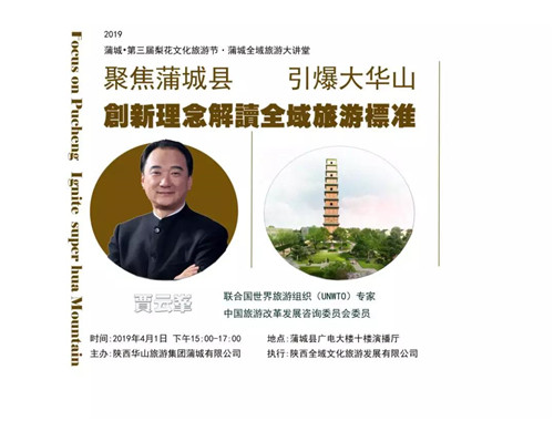 内容:邀请贾云峯先生( 联合国世界旅游组织(UNWTO)专家,中国旅游改革发展咨询委员会委员、亚太旅游协会(PATA)中国专家委员会秘书长)就“全域旅游”全国发展形势解读、“大华山”旅游线如何在新形势下发展与开拓新型的创意文化旅游 、如何挖掘、打造和宣传新时代蒲城全域旅游文化等进行专业解读。