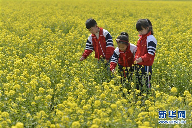 3月26日,几名小学生在河北省沙河市东葛泉村油菜花田内玩耍。