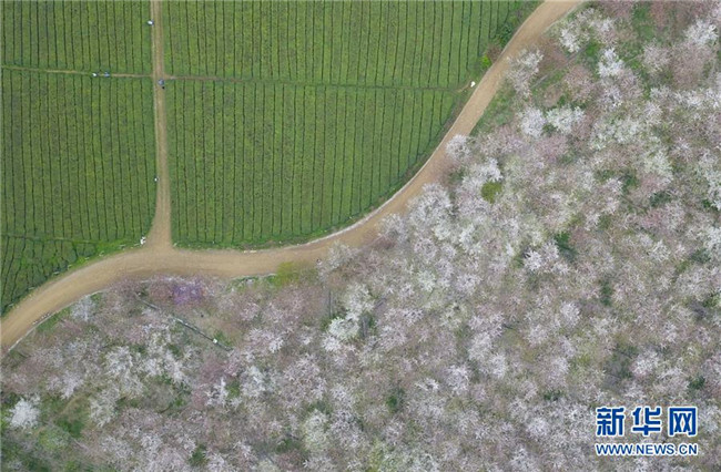 这是3月27日拍摄的贵州省贵安新区樱花观光园的樱花和旁边的茶园(无人机拍摄)。新华社记者 陈晔华 摄