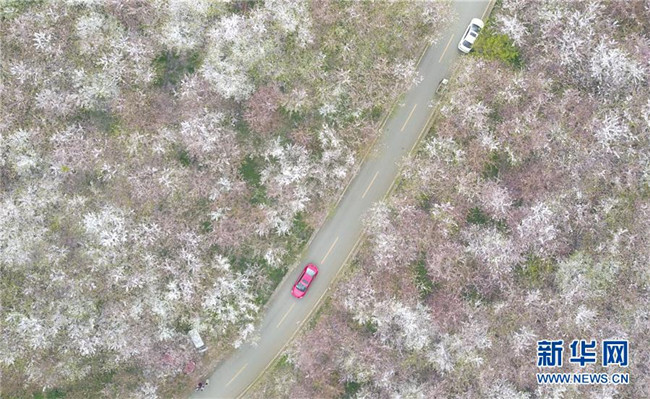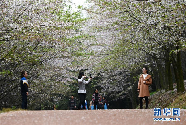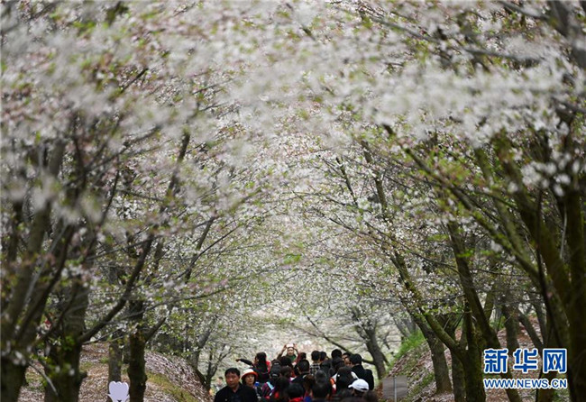 仲春时节,位于贵州省贵安新区樱花观光园内的樱花竞相绽放,如白雪般的樱花海吸引众多游客前来赏花观光。