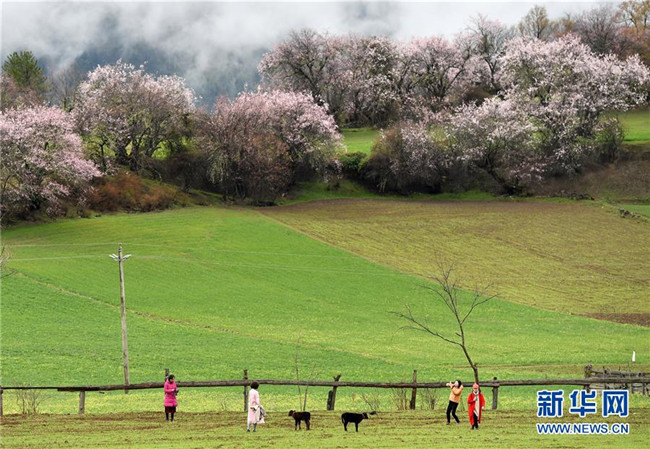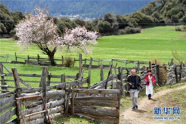 4月2日,游客在波密县古乡嘎朗村游玩。 新华社记者 李鑫 摄