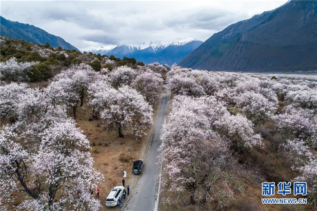 4月2日,游客在波密县桃花沟游玩(无人机拍摄)。 新华社记者 李鑫 摄