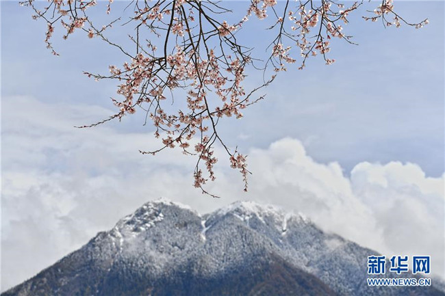 波密县古乡嘎朗村的桃花与雪峰相映成趣(4月2日摄)。 新华社记者 李鑫 摄