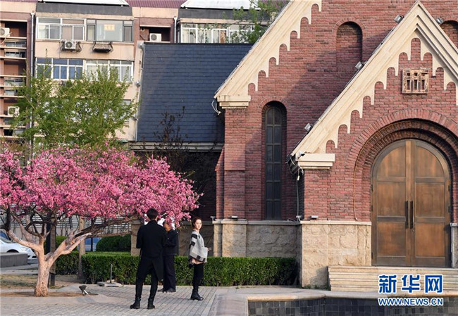4月8日,游客在天津五大道景区游览。四月的天津五大道,鲜花怒放,景色宜人。新华社记者马平摄