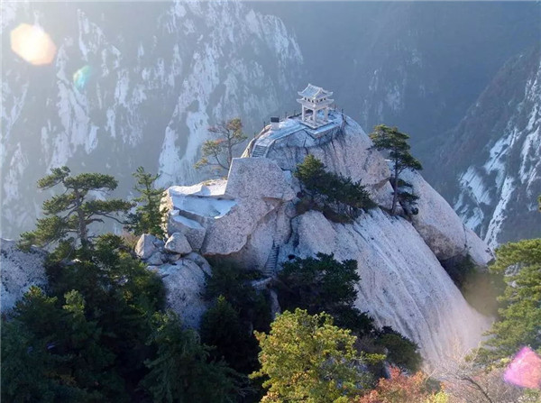 华山古称“西岳”,是我国著名的五岳之一,南接秦岭,北瞰黄渭,扼守着大西北进出中原的门户。华山由一块完整硕大的花岗岩体构成,有东、西、南、北、中五峰,主峰有南峰“落雁”、东峰“朝阳”、西峰“莲花”,三峰鼎峙。最高峰也是五岳最高峰—南峰“落雁”海拔2154.9米。