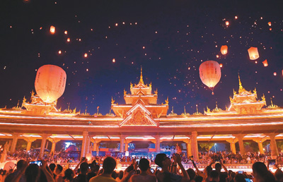 4月13日,为期3天的云南省西双版纳傣族自治州泼水节举行。节日期间,当地将举办划龙舟比赛、燃放孔明灯、泼水狂欢等活动,庆祝傣历新年。图为人们在西双版纳的澜沧江畔放飞孔明灯。