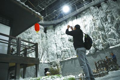 图为观众在摄影棚里观看“白雪皑皑”。 本报记者 和冠欣摄