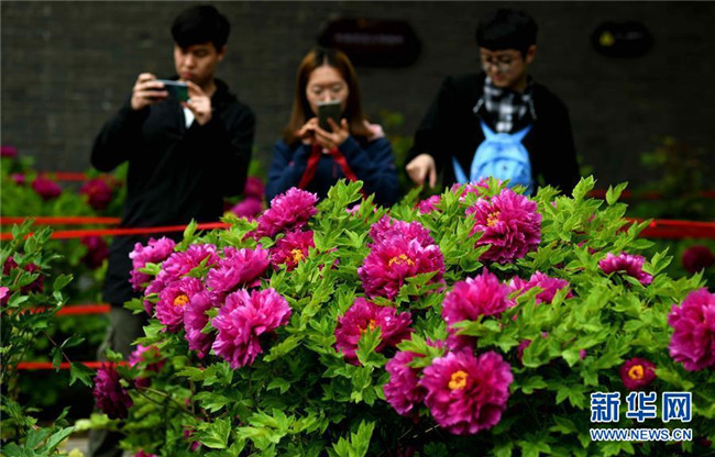 4月13日,游客在石家庄市正定荣国府影视基地游览拍照。时下,河北石家庄正定荣国府影视基地内的牡丹花次第开放,在春雨的滋润下显得格外晶莹剔透、美丽娇艳。 新华社发(陈其保 摄)