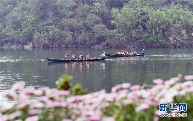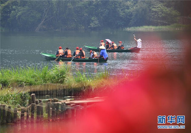 4月14日,游人在普者黑国家湿地公园荡舟观景。 位于云南省文山壮族苗族自治州丘北县的普者黑国家湿地公园山水秀丽、风景如画,吸引人们前来休闲度假。 新华社记者杨宗友摄