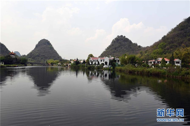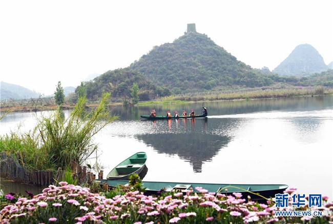这是普者黑国家湿地公园一景(4月14日摄)。 位于云南省文山壮族苗族自治州丘北县的普者黑国家湿地公园山水秀丽、风景如画,吸引人们前来休闲度假。 新华社记者杨宗友摄