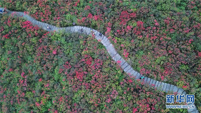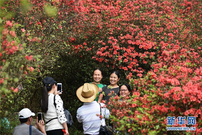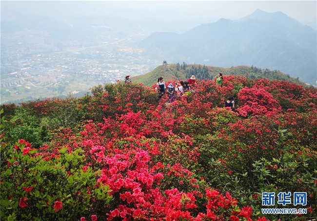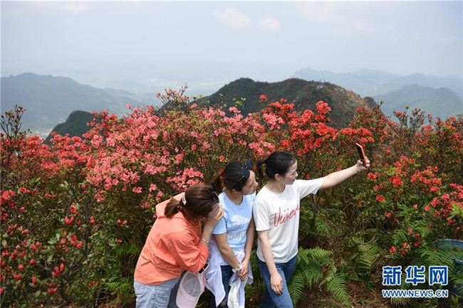 4月25日,游客在贵州省丹寨县龙泉山景区观赏映山红。暮春时节,位于贵州省黔东南苗族侗族自治州丹寨县龙泉山景区的映山红陆续开放,红遍山岭,吸引众多游客前来赏花观光。 新华社记者 杨文斌 摄