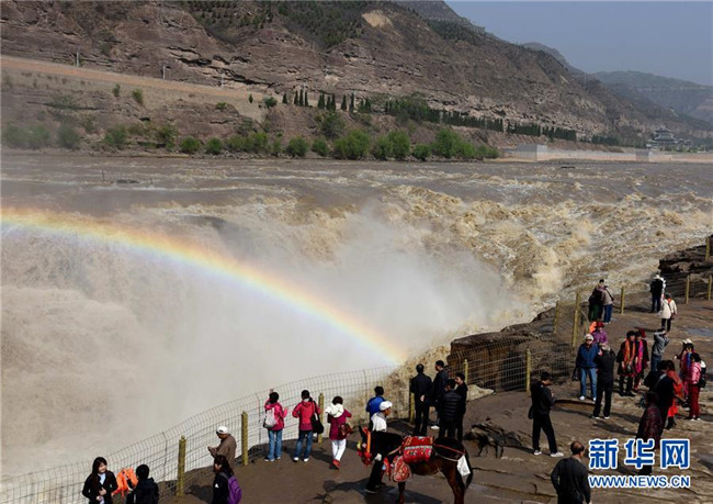 4月29日,游客在山西省临汾市吉县黄河壶口瀑布景区游览。 近日,受上游降雨和水库调节放水影响,晋陕交界的黄河壶口瀑布再现壮美瀑布群景观。 新华社发(吕桂明摄)