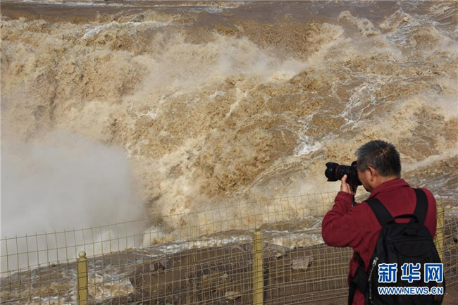 4月29日,游客在山西省临汾市吉县黄河壶口瀑布景区拍照。 近日,受上游降雨和水库调节放水影响,晋陕交界的黄河壶口瀑布再现壮美瀑布群景观。 新华社发(吕桂明摄)