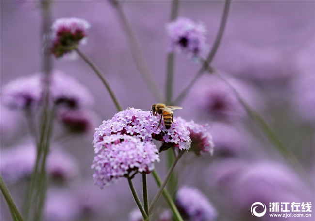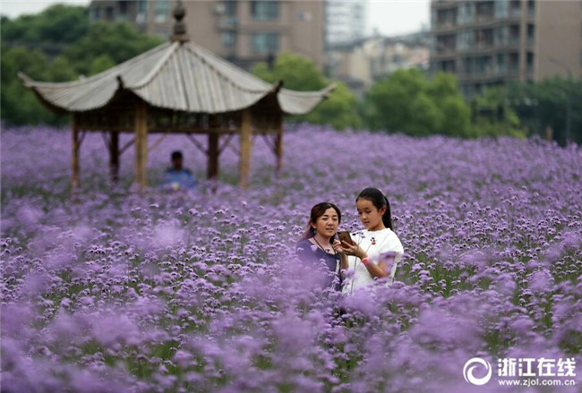 5月12日,在杭州城北体育公园边,柳叶马鞭草进入盛花期,开成了一片紫色花海,吸引着许多市民在花海里惬意徜徉。(浙江在线记者 林云龙 摄)