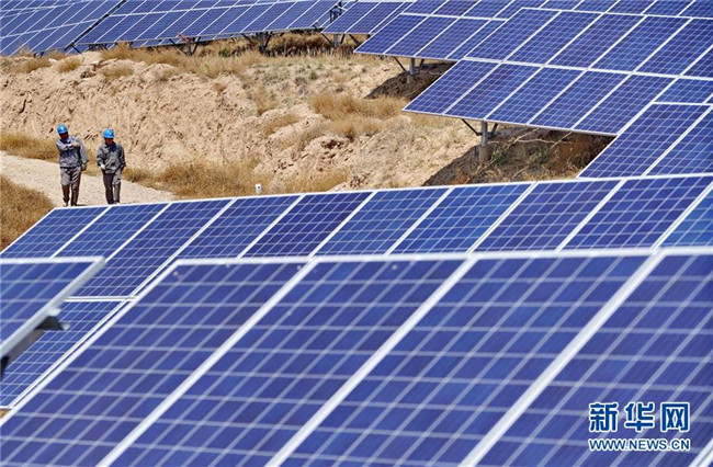 工人在河北省张家口市怀安县西沙城乡西沙城村附近荒山上的光伏发电场巡查并网线路(5月13日摄)。新华社记者 杨世尧 摄