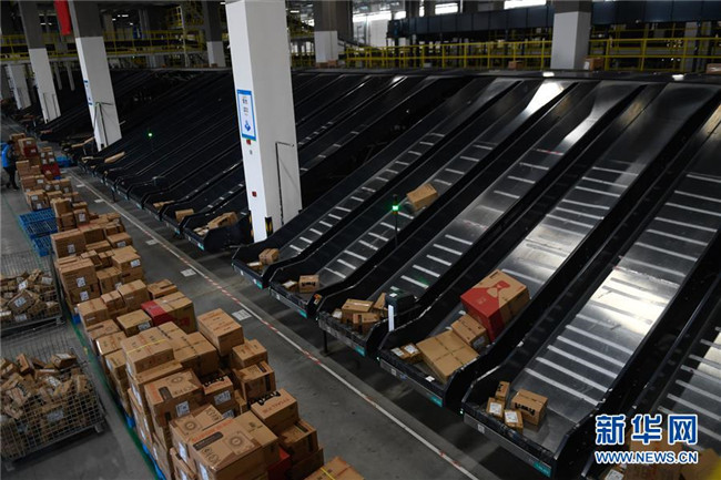 在浙江嘉兴菜鸟“未来园区”,商品按照包裹地址的不同进行自动分拨(3月27日摄)。新华社记者 黄宗治 摄