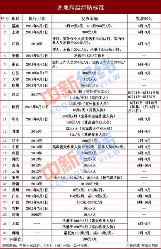 此外,2012年施行的《防暑降温措施管理办法》中明确规定,高温津贴标准由省级人力资源社会保障行政部门会同有关部门制定,并根据社会经济发展状况适时调整。中新经纬客户端梳理目前各地高温津贴实施办法发现,部分省份的高温津贴标准长达10年未曾改变。