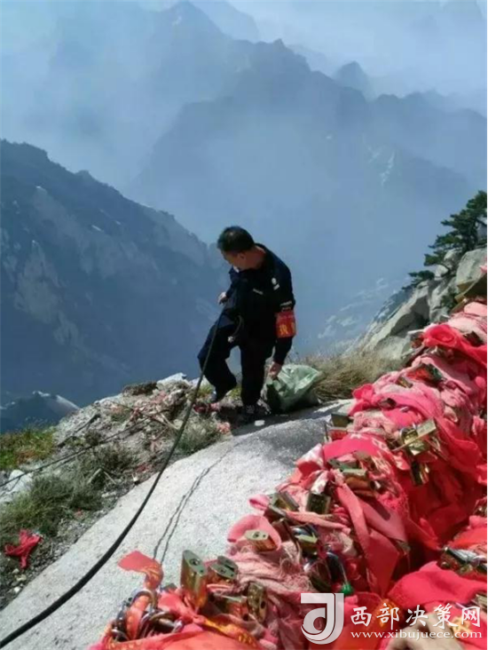 当游客不听劝阻屡次翻越围栏拍照留念时,耐心劝阻,警示教育是我们华山人的家风;